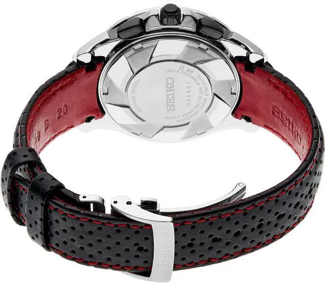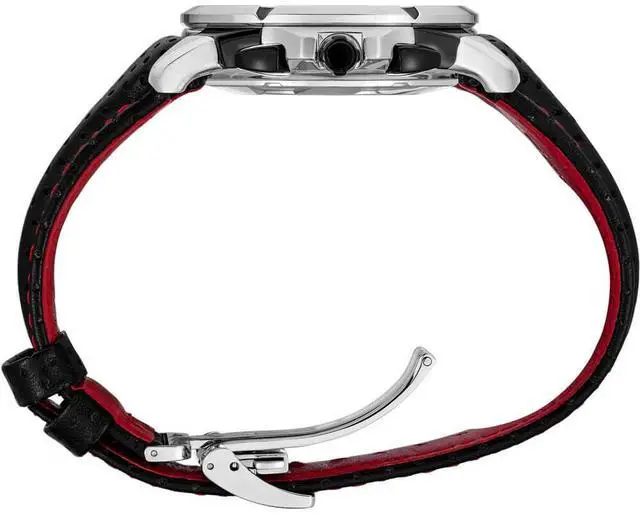 Designed to echo driving gloves, the black perforated leather strap includes red contrast stitching and a tri-fold push button release clasp. With a stainless steel case, this dynamic watch includes a sapphire crystal, screwdown caseback, and classic cabochon crown. The chronograph function offers timing to 60 minutes in 1/5-second increments with split time measurement. 10 bar, 100M Water Resistant.