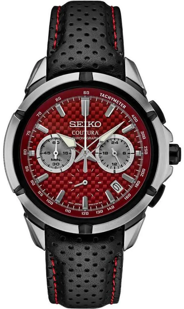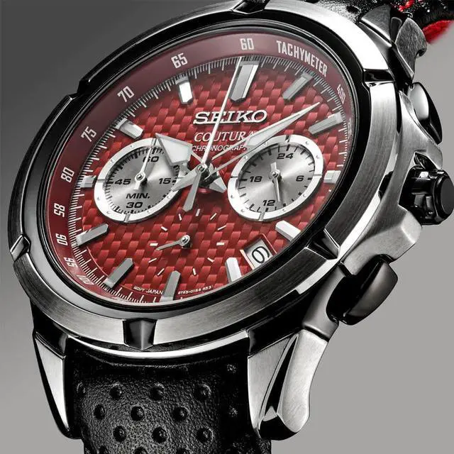 From the Coutura Collection. Delivering the perfect blend of technology and design for those on the move, the Coutura Collection combines bold angularity and shading with superior timekeeping for effortless sport/dress style. Inspired by motor sports, with a new case design incorporating the angles and edges of racecar architecture, this dashingly sculpted chronograph features a multi-layer carbon-fiber patterned red dial styled to suggest a dashboard, with prominent 24-hour and chronograph minute subdials at 3 and 9 oclock, tachymeter outer ring, date calendar, and LumiBrite hands and markers. Applied markers and subdial rings add a rich dimensionality, while the black accents punctuating the bezel provide a sense of propulsive action.