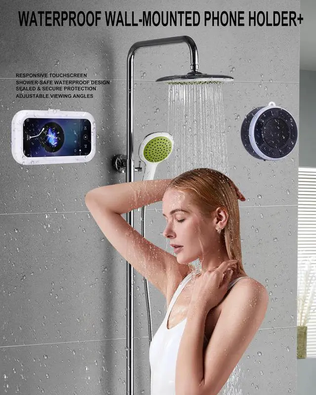 IPX7 Waterproof Speaker with Shower Phone Holder Built for wet environments. Sealed design protects against splashes while the shower phone holder keeps your device secure for hands-free viewing.