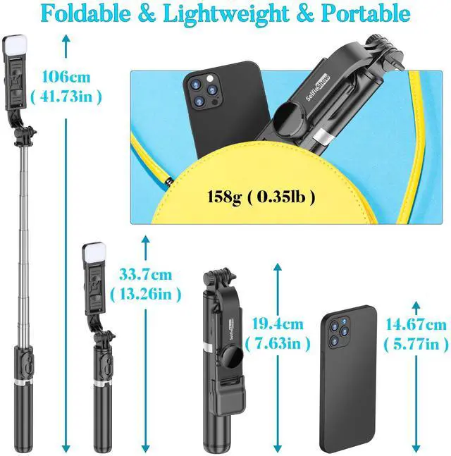 - With the tripod legs collapsed and rod extended, it is a fully extendable handheld selfie stick.