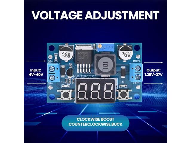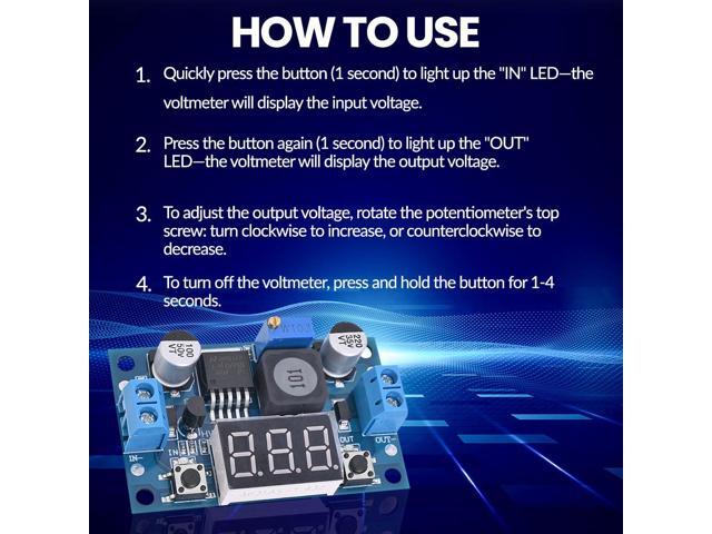 - LED Numeric Display: Buck converter equipped with an LED voltmeter display. The voltmeter has a measurement error of ±0.1V. The input voltage range is from 4.0V to 40V, and the output voltage range is from 1.25V to 37V(Note: If the input voltage is below 4V, the onboard voltmeter will not operate and no display will be shown). The voltmeter can be switched off by holding the switch for over 1 second and less than 4 seconds, then releasing it. Once the voltmeter is off, just press the switch briefly to turn it on