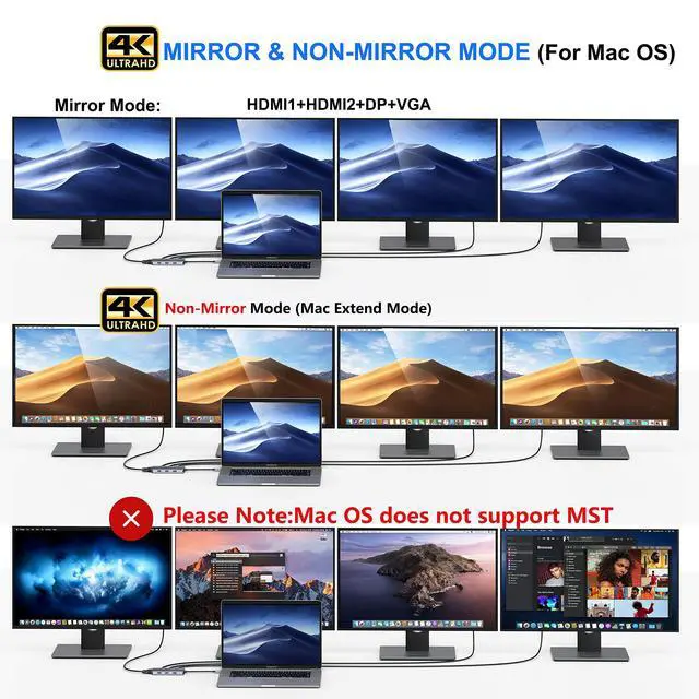 | On Mac devices: | CAN NOT support MST Display, ONLY Mirror Mode due to Mac OS limitation; Not support Macbook pro air mini M1 |