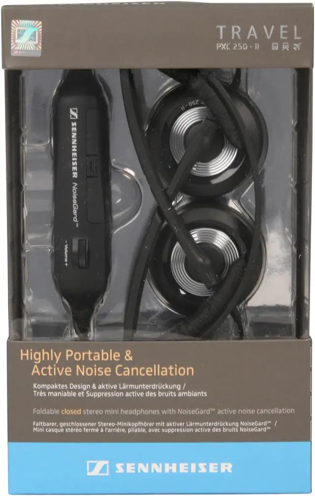 | Features | Sennheiser NoiseGard technology dramatically reduces droning background noise NoiseGard controls have been reduced in size by 50% for increased handling convenience and better portability Neodymium magnets and Duofol diaphragms for audiophile-grade sound reproduction Integrated volume control for enhanced usability and convenience Collapsible design with metal-reinforced headband ensures portability and durability Operates for about 50 hours on a single AAA battery Optimized for portable media players and in-flight entertainment systems |