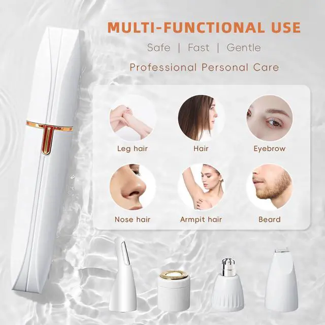 4 in 1 Nose Hair Trimmer for Multiple UsePrecision nose hair trimming heads for safe, comfortable grooming inside nostrils. Stainless steel blades trim smoothly without pulling for a clean look in seconds. Includes 1 nose hair trimmer, 1 shaver, 1 eyebrow shaper, and 1 face shaver. Tackle face, arms, legs, underarms, nostrils, and bikini areano residue left behind.