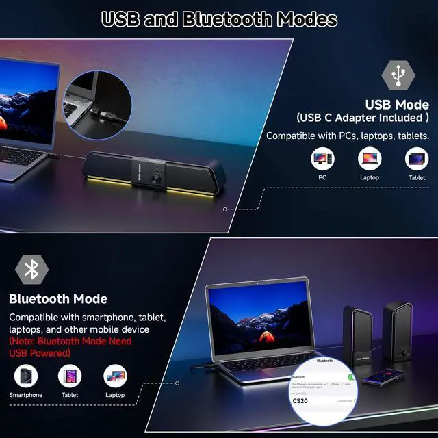 Bluetooth mode: turn on your device's Bluetooth to pair with CS20 (Note: Bluetooth Mode Need USB Powered).