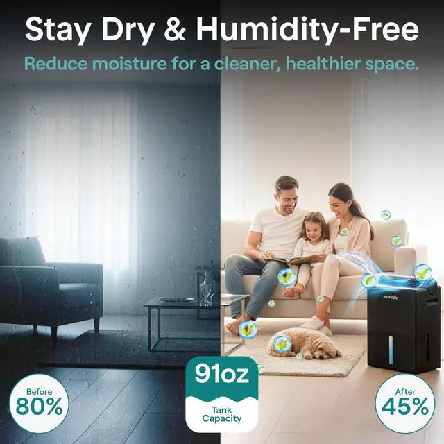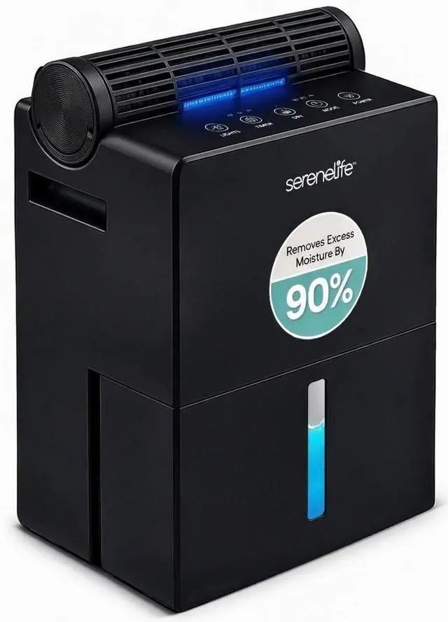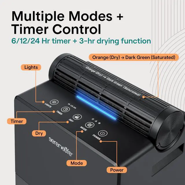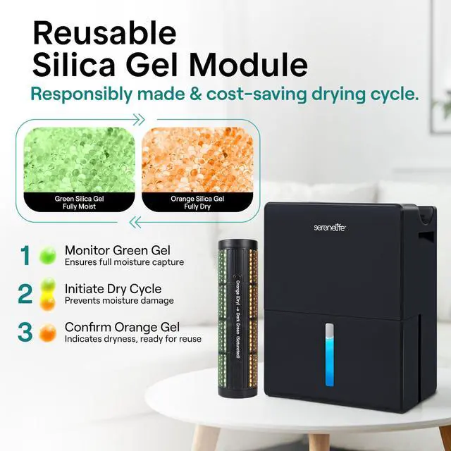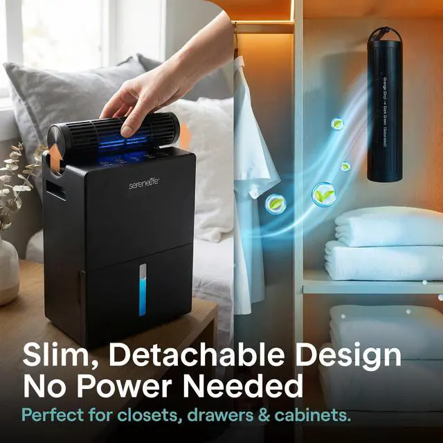 Take control of indoor moisture with this advanced dehumidifier designed for reliable everyday use. Built as a powerful yet compact home dehumidifier, it maintains ideal humidity levels between 4555% automatically, helping reduce mold, odors, and allergens in your space. Covering up to 1500 square feet, it works efficiently in bedrooms, bathrooms, basements, closets, and offices. This portable dehumidifier features a unique 2-in-1 design with a removable moisture-absorbing cylinder and drying base. Use the cylinder separately in tight areas like drawers or cabinets, then recharge it in just 23 hours for continuous performance. As a small dehumidifier, it delivers strong results while maintaining a sleek, space-saving footprint. Quiet 50dB operation makes this room dehumidifier ideal for overnight use. Choose from adjustable timer settings or activate sleep mode for energy-efficient performance. Two fan speeds allow you to customize airflow based on your comfort needs. Designed for convenience, safety, and flexibility, this dehumidifier combines smart humidity detection, automatic shut-off, and dependable performance in one compact unit. Whether you need a small dehumidifier for personal spaces or a full-coverage home dehumidifier, this versatile portable dehumidifier provides efficient, worry-free moisture control.