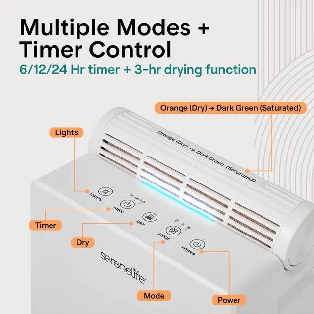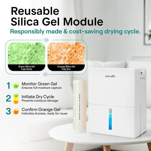 Take control of indoor moisture with this advanced dehumidifier designed for reliable everyday use. Built as a powerful yet compact home dehumidifier, it maintains ideal humidity levels between 4555% automatically, helping reduce mold, odors, and allergens in your space. Covering up to 1500 square feet, it works efficiently in bedrooms, bathrooms, basements, closets, and offices. This portable dehumidifier features a unique 2-in-1 design with a removable moisture-absorbing cylinder and drying base. Use the cylinder separately in tight areas like drawers or cabinets, then recharge it in just 23 hours for continuous performance. As a small dehumidifier, it delivers strong results while maintaining a sleek, space-saving footprint. Quiet 50dB operation makes this room dehumidifier ideal for overnight use. Choose from adjustable timer settings or activate sleep mode for energy-efficient performance. Two fan speeds allow you to customize airflow based on your comfort needs. Designed for convenience, safety, and flexibility, this dehumidifier combines smart humidity detection, automatic shut-off, and dependable performance in one compact unit. Whether you need a small dehumidifier for personal spaces or a full-coverage home dehumidifier, this versatile portable dehumidifier provides efficient, worry-free moisture control.
