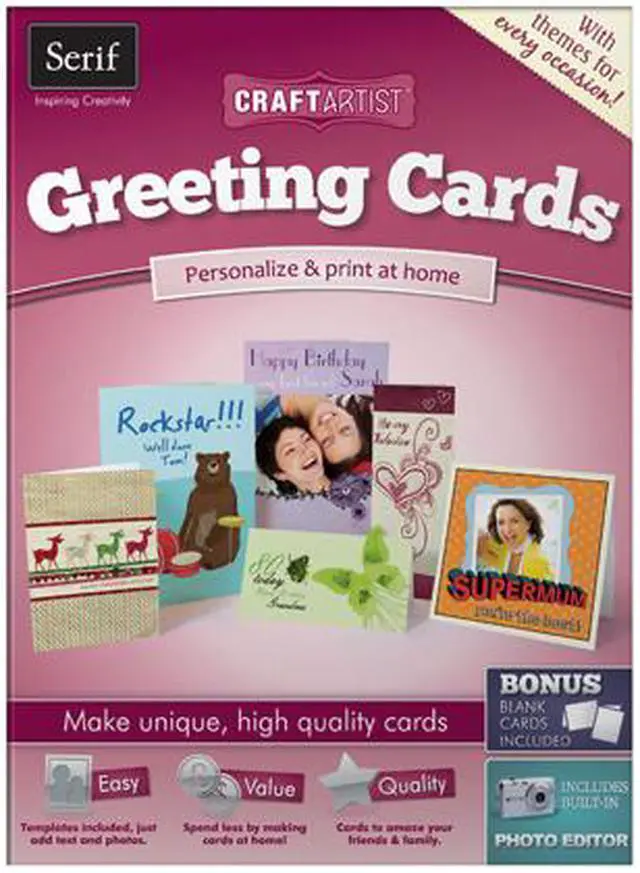 | Feature | CraftArtist Greeting Cards is the perfect software for creating high-quality cards for all occasions. You'll be able to quickly and easily make cards that aren't just pre-made templates, but are exactly the way you want them. CraftArtist Greeting Cards is incredibly easy to use, thanks to its simple drag-and-drop function. Designs can be personalised with unlimited pictures and text, plus there are craft tools and a built-in photo editor to help deliver high-quality results that are guaranteed to impress friends and family. Features: Incredibly easy to use – just drag and drop to create a card for every occasion. Personalize every design with photos and text using one-click true-to-life tools like scissors and stencils. Use the built-in photo editor to make your photos perfect. On-screen video tutorials you to achieve amazing results. Save money – never buy expensive cards again. What's included: 1 x Program DVD. 1 x CraftArtist Printed User Guide. 1 x Getting Started Flyer. 1 x Card Blanks Kit. |