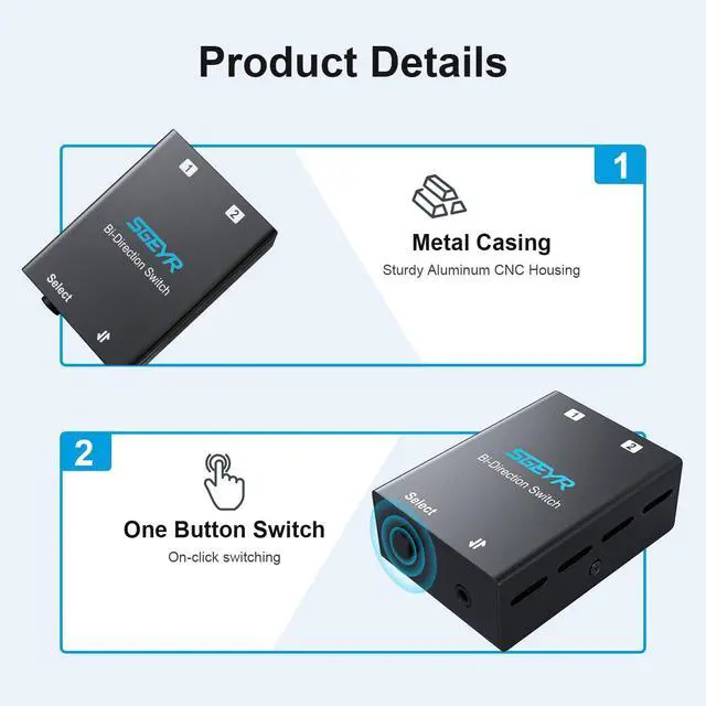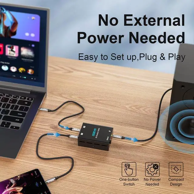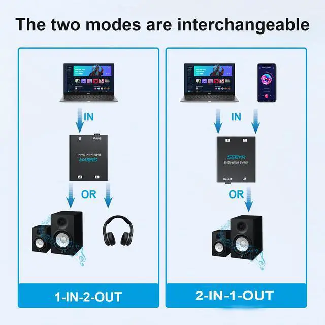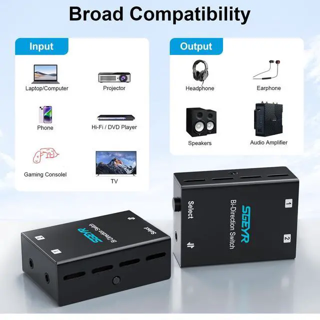 This SGEYR audio switch is a small and exquisite bidirectional 3.5mm audio interface switch that allows users to easily switch between two sound sources/playback devices.
