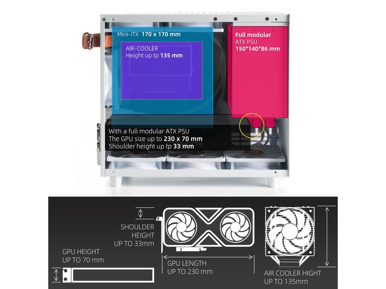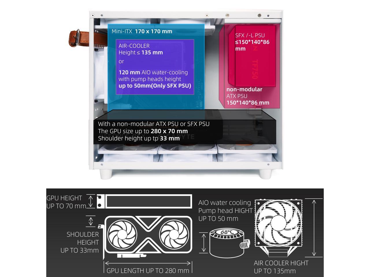 - PSU & CPU cooler: Supports SFX/SFX-L PSU (125 x 140 x 64 mm) and ATX PSU (150 x 140 x 86 mm ). It accommodates CPU air coolers up to 135 mm in height or a 120 mm AIO water cooling with pump heads up to 50 mm.