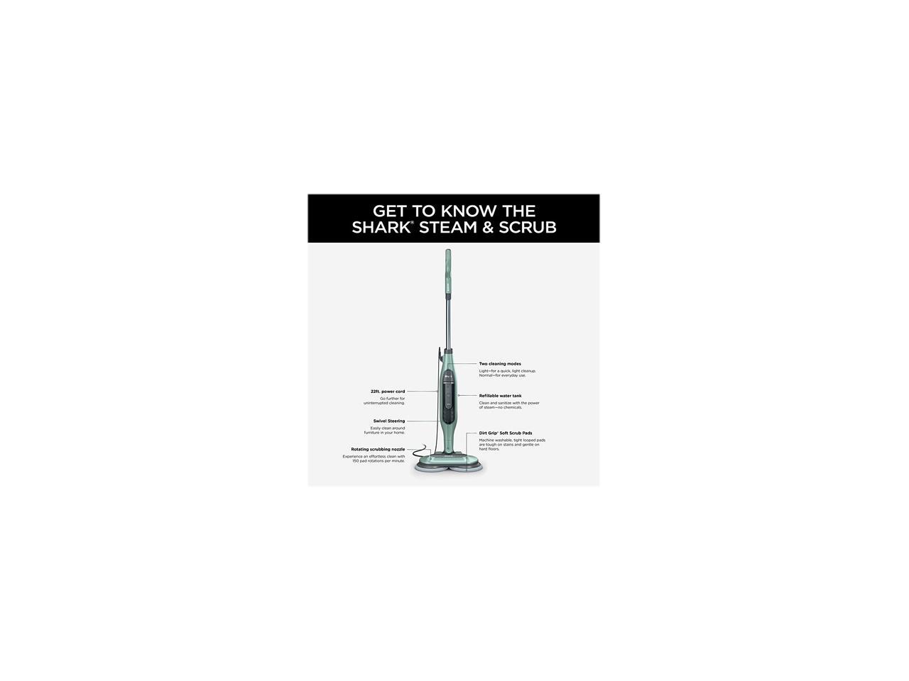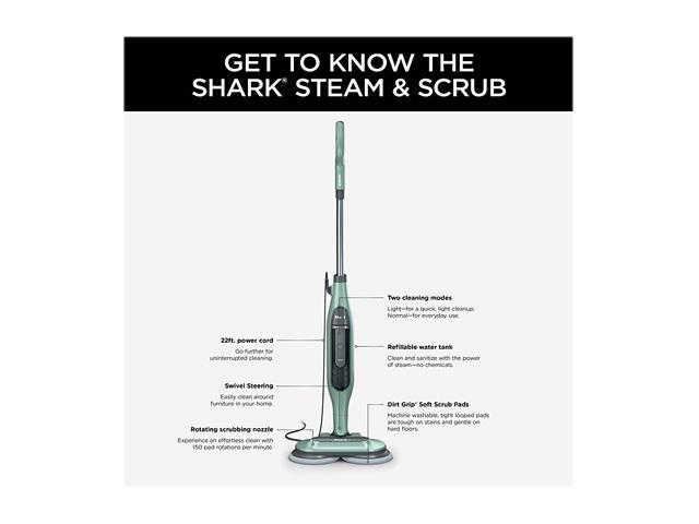 Includes 1 Shark Steam & Scrub Steam Mop, 2 Dirt Grip Soft Scrub washable pads and 1 fill flask.