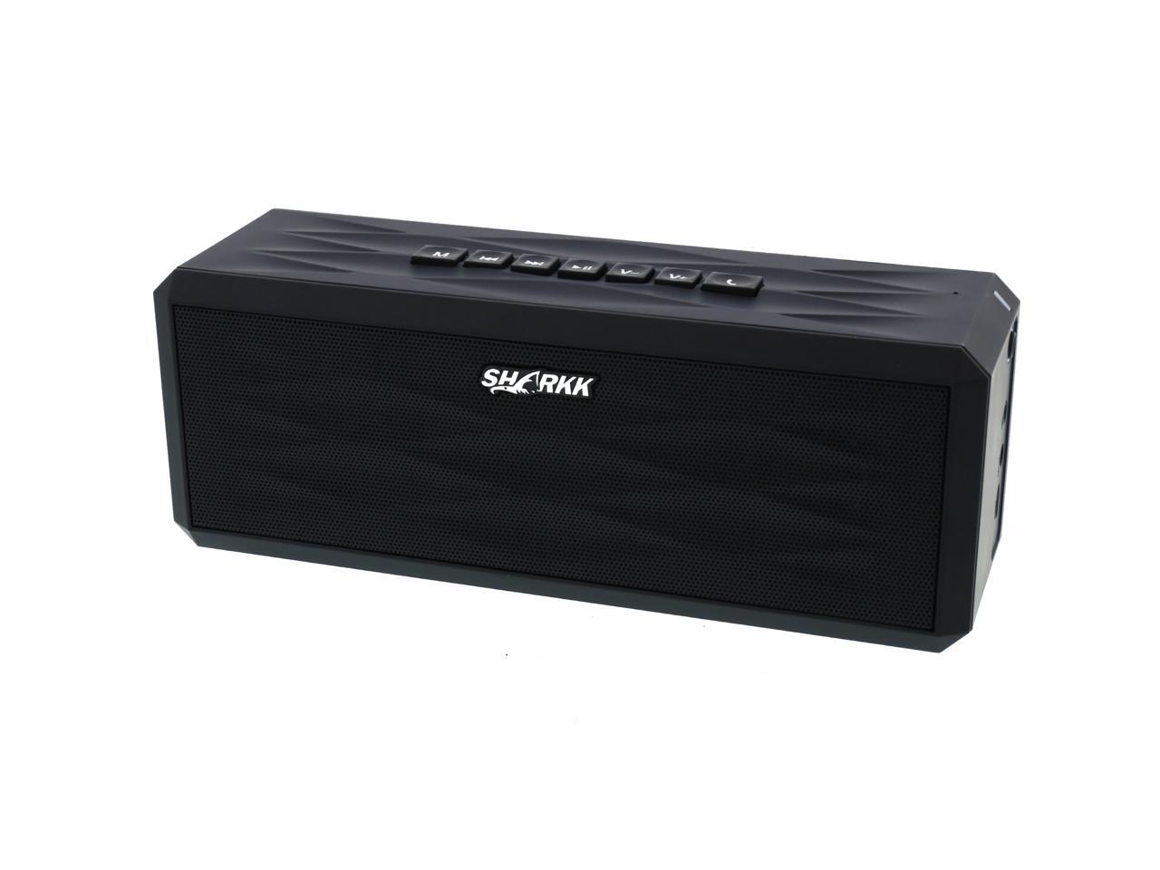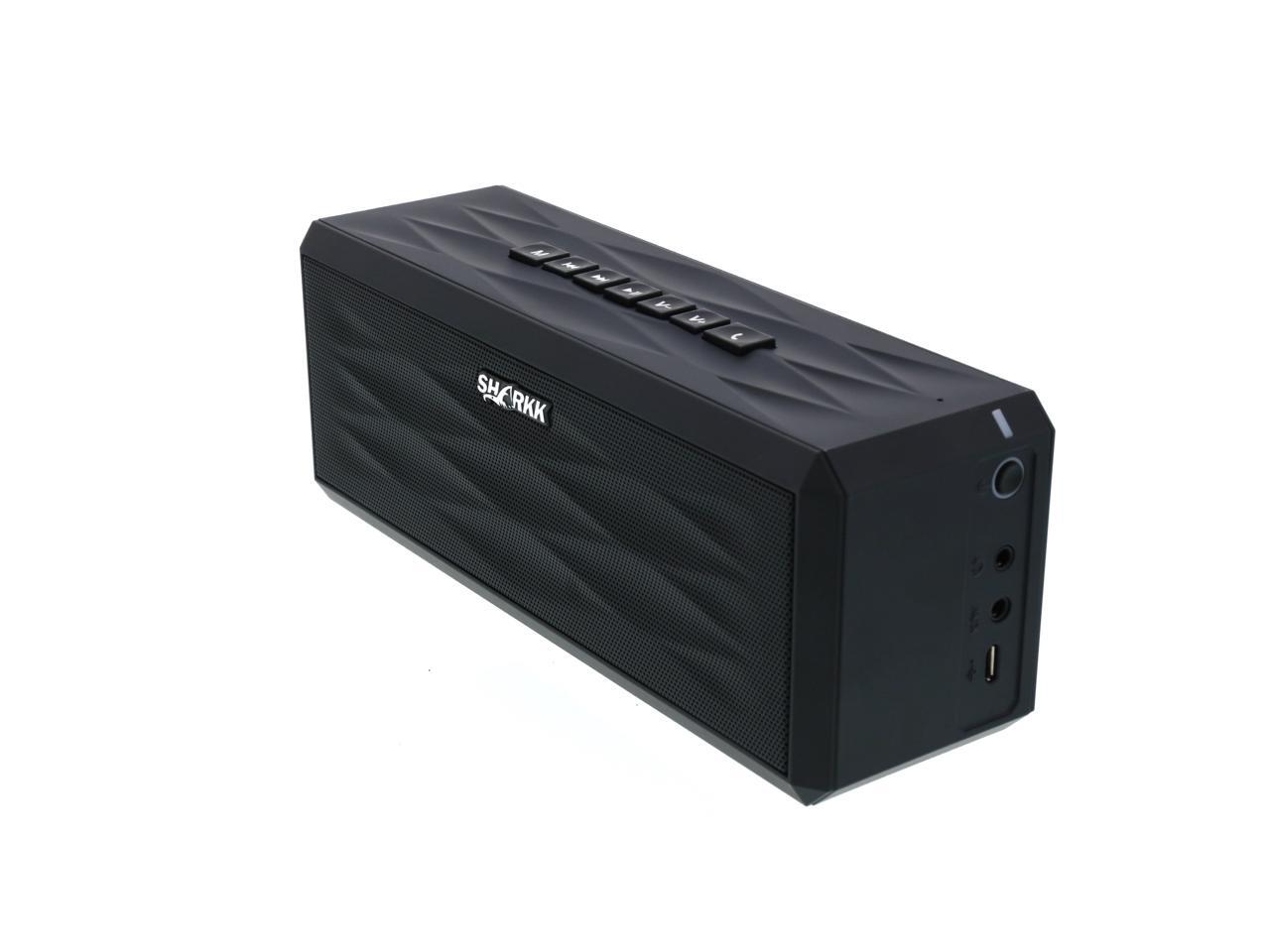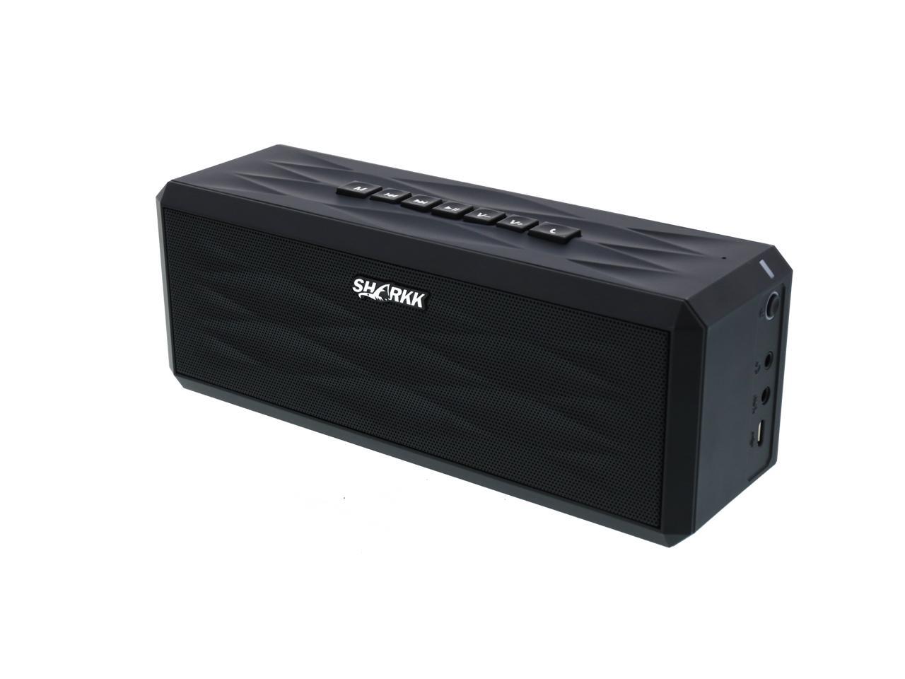 Raise the roof with the powerful 10W SHARKK Boombox Speaker. With the rechargeable, high capacity 4400mAh polymer Li-ion battery, you can rock out with up to 18 hours consecutive playing time! Need to make a call? No problem! The built in HQ Mic allows you to easily make and receive calls right from your speaker! Among the supported media connections are: AUX Cable, Bluetooth 4.0 and NFC, with "siri" function.