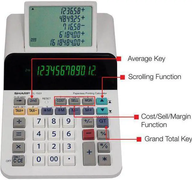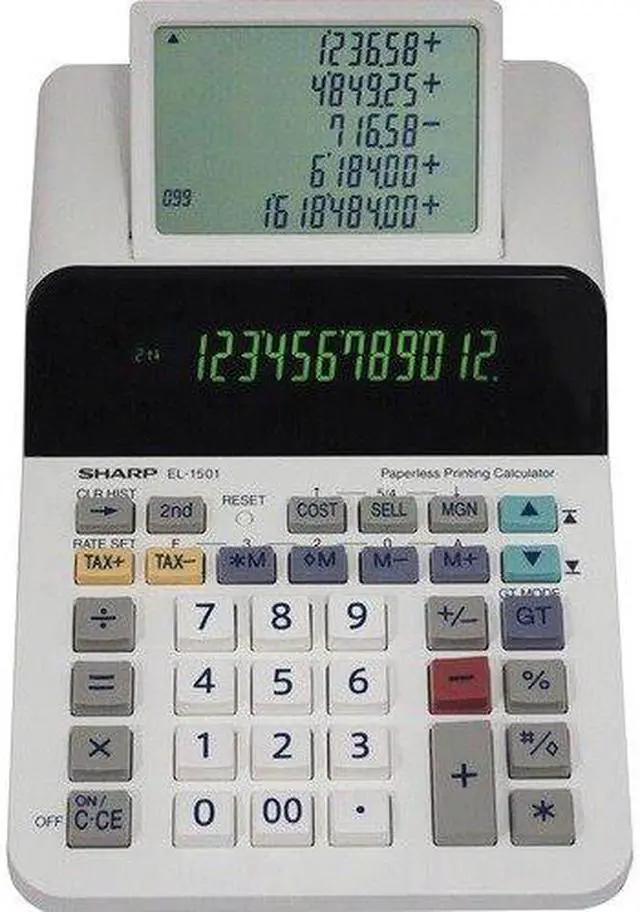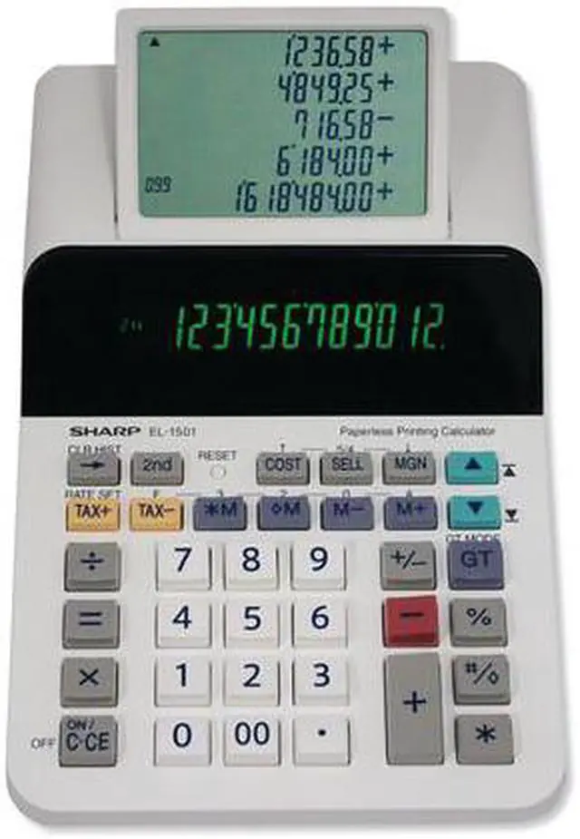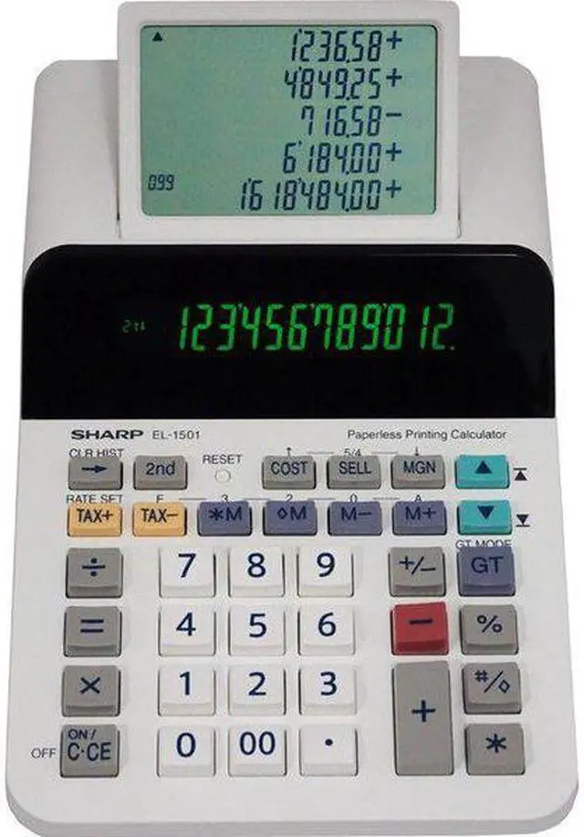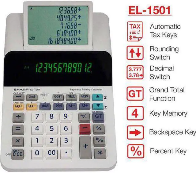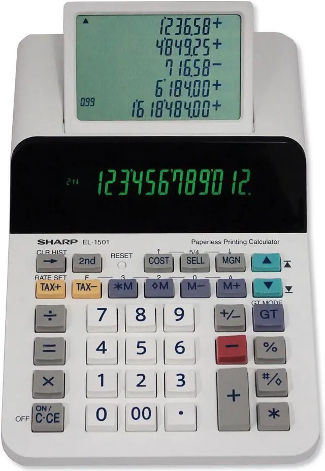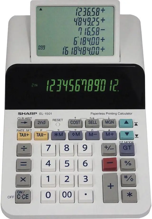 The Sharp EL-1501 compact paperless printing calculator is a unique and powerful calculator, perfect for those that need the power of a printing calculator with the functionality of a desktop calculator. The EL-1501 features a 12-digit display with a five-line scrolling LCD. This larger scrolling display allows a user to go back and view up to 300 previous entries. This compact paperless printing calculator is whisper-quiet, making it usable in any office environment.