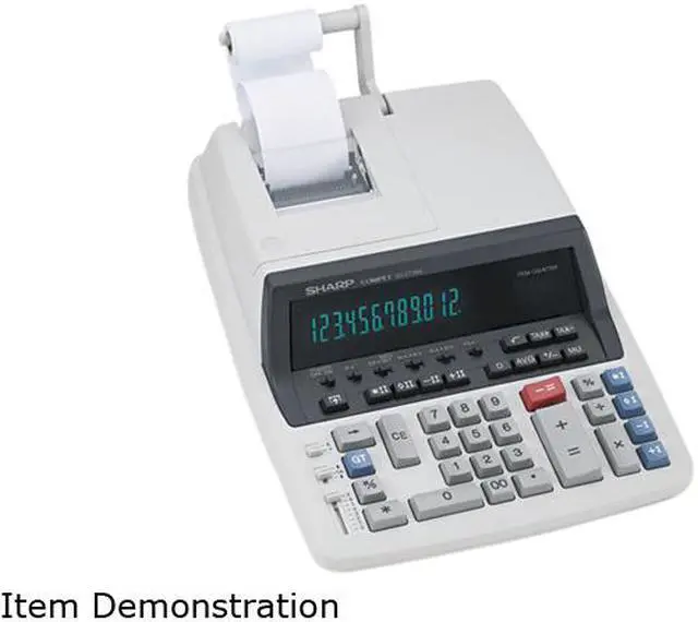 12-digit commercial calculator features two-color printing, extra-large 17mm fluorescent blue display, automatic three digit punctuation, and item counter display. Print 4.8 lines per second with positive numbers in black and negative number in red. Calculator also prints up to 12 numerals and three symbols. Date key prints the date. Use the grand total key to add the grand total of several calculations such as the total prices times units on an invoice. Multiple Use key simplifies business calculations to save time and increase efficiency by handling functions like margin, markup, selling prices, costs, and percent changes. Other functions include two independently accessible four-key and grand memories, tax calculations from stored tax rate memory, automatic first factor accumulation, average key, item counter, two-key rollover, double zero key, sign change key, and right-shift key. Decimal positions are floating or fixed (6, 3, 2, 1, 0). Calculator runs on AC operation.