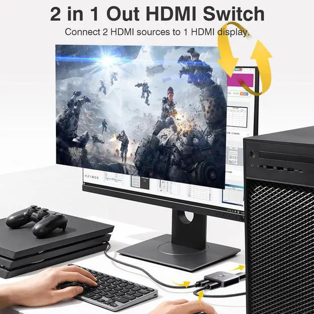 Connect two HDMI sources (like consoles or PCs) to a single display with ease. Switch between devices instantly using the one-button selector—no need to plug or unplug cables. Supports HDMI 2.1, 8K@60Hz, 4K@120Hz, delivering stable, high-quality visuals for gaming, movies, and work.