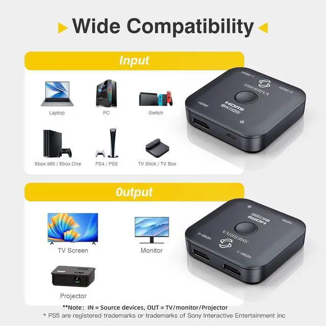 SHERRIVA 8K HDMI Switch 2 in 1 Out