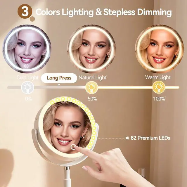 Short press button to switch cool/natural/warm light, and long press button to adjust brightness.