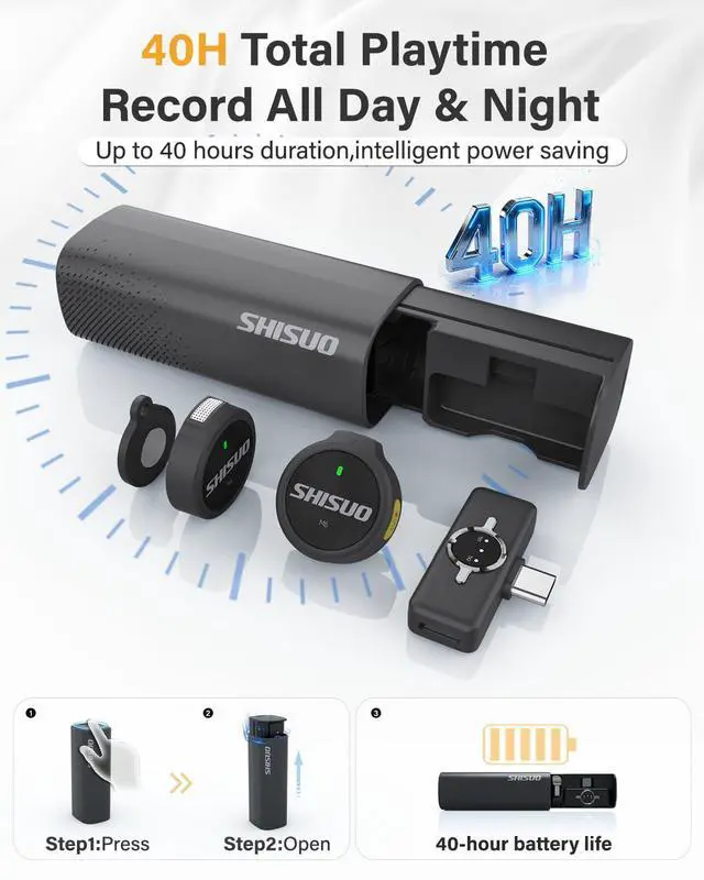 Yes, it includes 2 transmitters for simultaneous recording, ideal for interviews. Each mic provides up to 7 hours of continuous use, and with the charging case, you get a total of 40 hours of playtime. Perfect for all-day creating.