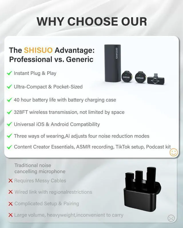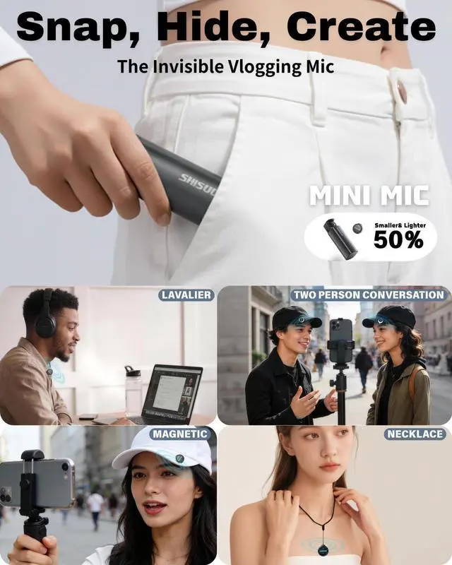 Perfect for vlogging! AI Noise Cancellation filters wind for clear audio. The strong magnetic design lets you snap it on a shirt or hide it inside a collar for an invisible look. Supports 328ft (100m) stable transmission.