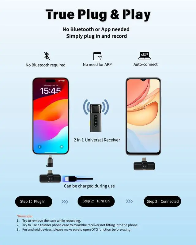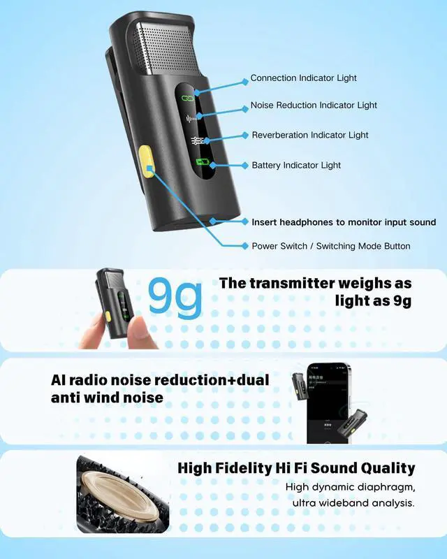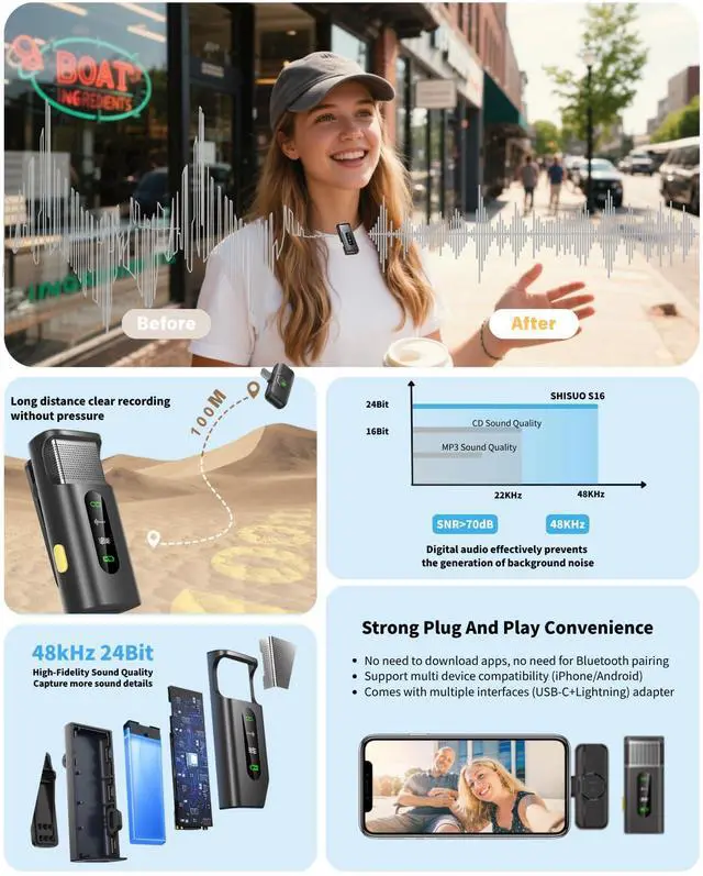 Take Your Content Creation to the Next Level with SHISUO S16 Wireless Microphone Whether you are a professional vlogger, a journalist, or just love creating videos for TikTok and YouTube, audio quality can make or break your content. The SHISUO S16 is designed to deliver studio-grade sound in a compact, easy-to-use package. Why Choose SHISUO S16? Crystal Clear Audio: 48kHz/24-bit resolution captures every detail of your voice. Smart Noise Cancellation: Built-in AI chip minimizes background noise, perfect for outdoor recording. Wide Compatibility: Comes with USB-C, Lightning, and USB-A adapters. Works with iPhone 15/16, older iPhones, Androids, and Laptops. No Wires, No Hassle: 328ft wireless range allows you to walk away from the camera freely. Real-Time Monitoring: Plug in the included earphones to hear exactly what is being recorded. Package Includes: 1 x Transmitter (Mic) 1 x Receiver (2-in-1) 1 x Wired Earphone 1 x Charging Cable 1 x Windshield 1 x Travel Storage Case (Zippered)