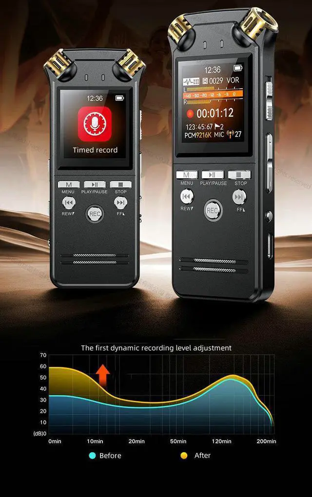 When the voice recorder is turned on in the voice activated recording, the recorder will automatically enter the recording state when it detects that there is a sound around and reaches a certain decibel sound required by the voice recorder, the When the sound disappears, the voice recorder automatically stops recording and going to standby state.