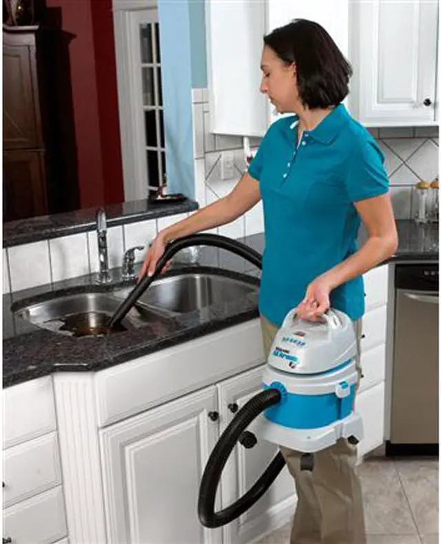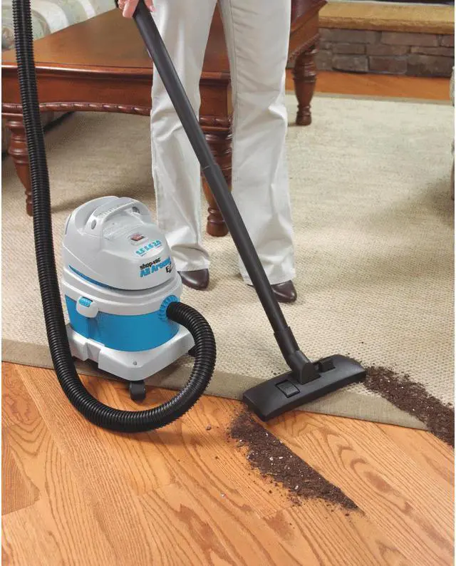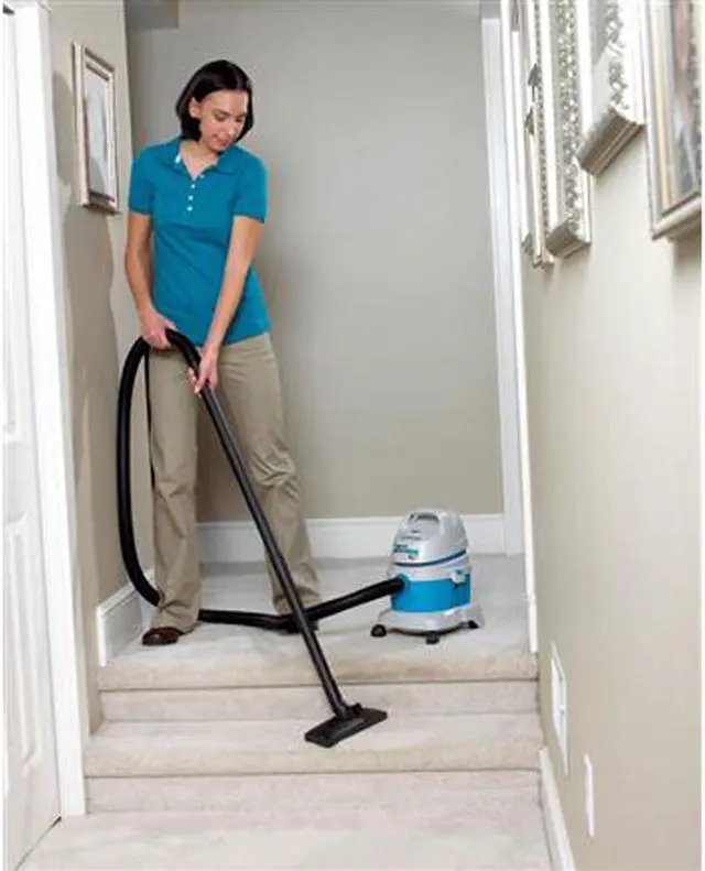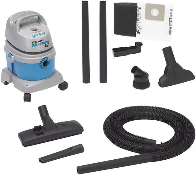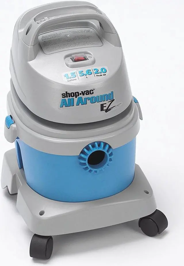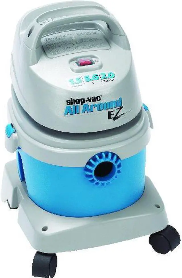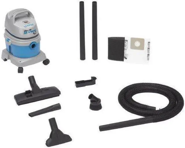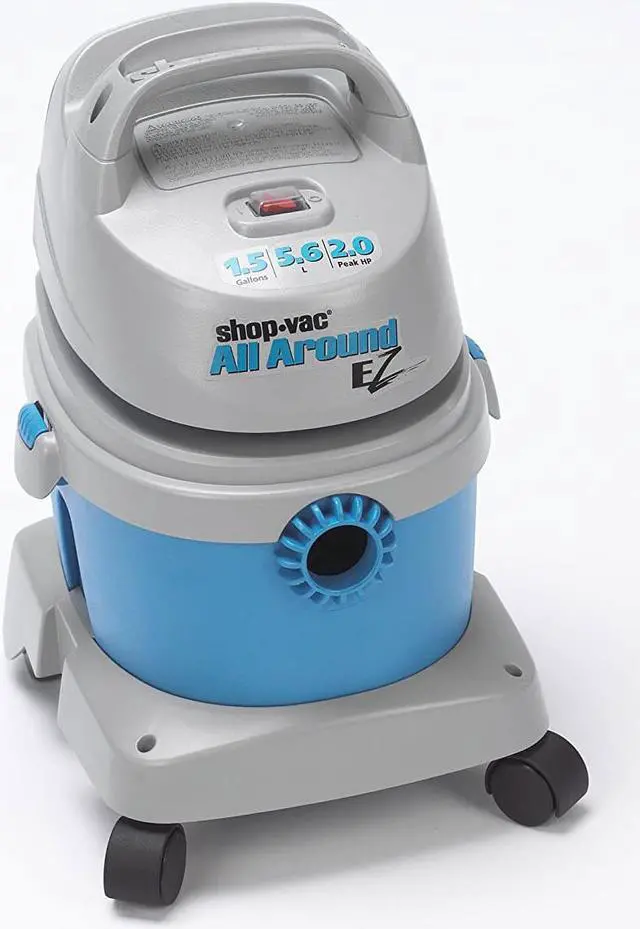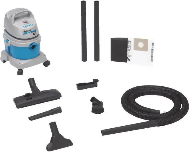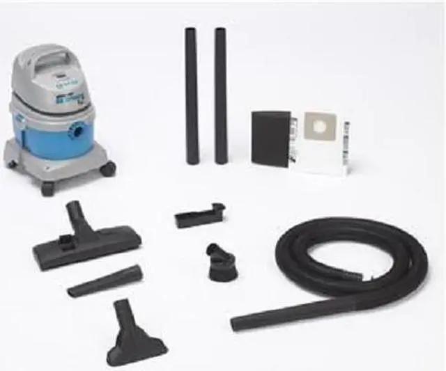 2.0 peak HP (horsepower) with quiet operation. Compact size. Dent and rust-resistant tank. Automatic float shut-off prevents wet pickup overflow. 120 cfm (cubic feet per minute). Includes 7' x 1.25" hose, 2 extension wands, floor nozzle, crevice tool, gulper nozzle, round brush, foam sleeve, collection filter bag, and wall mount bracket. Top and side tank handles plus dual-wheel hooded casters for mobility. Can be used for various shop and/or home use applications. 18' power cord. "Peak Horsepower" (PHP) is a term used in the wet-dry vacuum industry for consumer comparison purposes.