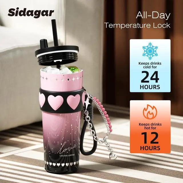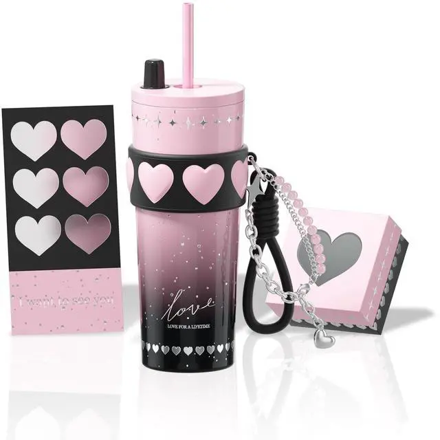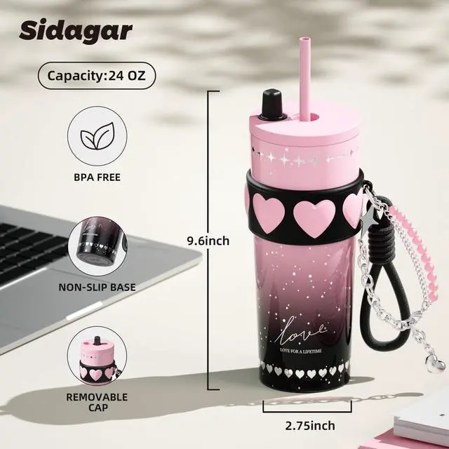 24 oz Stainless Steel Tumbler with Lid and Straw, Insulated Coffee Mug, Leak Proof, Portable Iced Travel Water Bottle, Reusable Thermal Coffee Cup Gift for Women, Pink