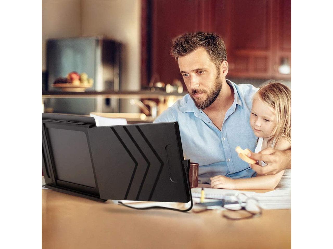 ULTRA-PORTABLE >>SideTrak Slide weighs 1.65lbs and has a strong magnetic connection that allows you to pick your laptop up while the portable monitor is still open and walk from room to room without having to take down your whole setup!