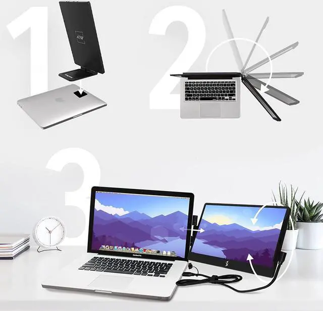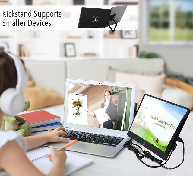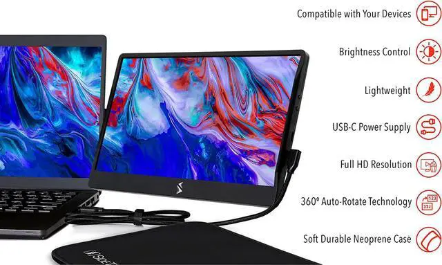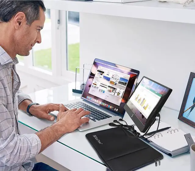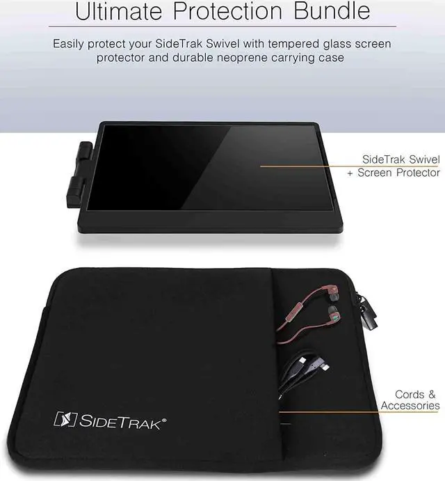 Instantly double your laptop screen workspace with this game-changing attachable portable monitor technology! SideTrak Swivel is a 12.5 FHD IPS monitor that magnetically attaches to the back of your laptop with a metal plate so you can effortlessly work anywhere with two screens. Whether you are traveling between your home and office or need to protect your portable monitor from clumsy kids and pets, this case is the perfect solution! This included case is cushioned, shock-absorbent design protects against dents and scratches. It was also designed with a built-in pocket so that you can conveniently store your cords, earbuds, pens, and more when youre on-the-go.