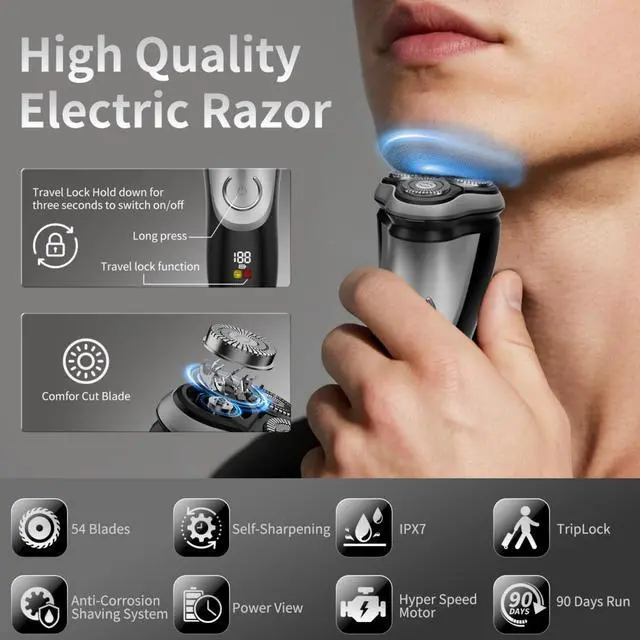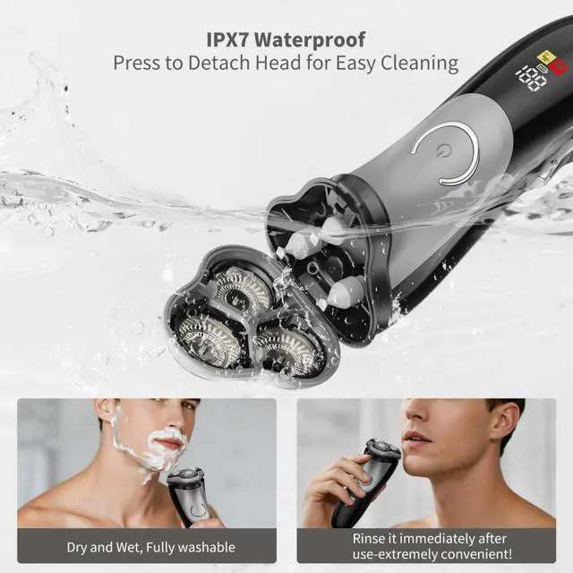 Wet & Dry Shaving: With an IPX7 waterproof rating, mens' electric shaver is versatile enough for wet and dry use. Whether you prefer a refreshing shave in the shower with foam or a quick dry shave, this shaver delivers a smooth, comfortable experience.