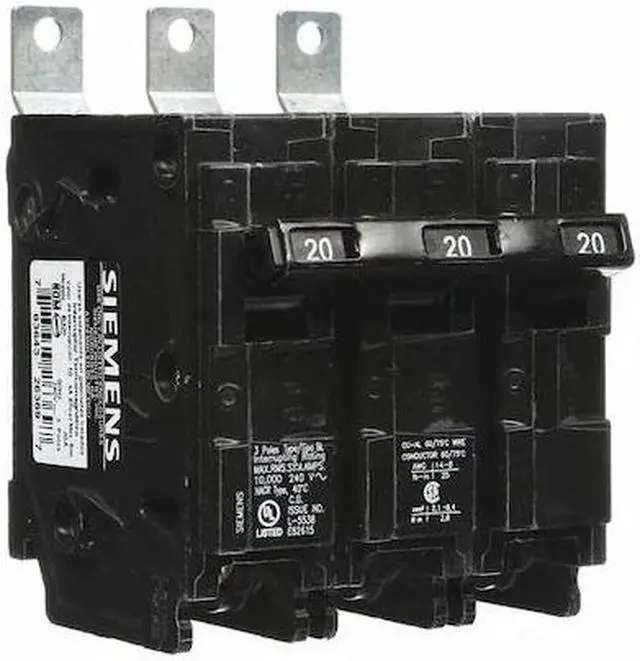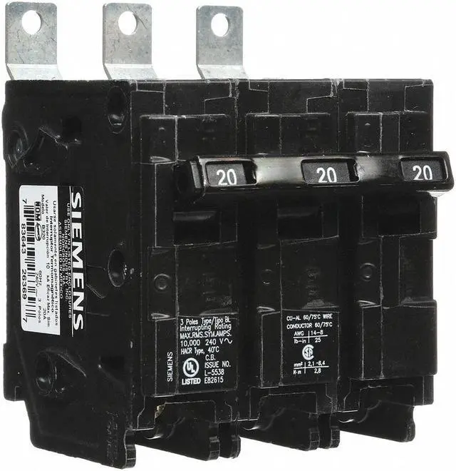 Miniature Circuit Breaker, Amps 20 A, AC Voltage Rating 240V AC, Circuit Breaker Type Standard, Number of Poles 3, DC Voltage Rating Not Rated, Circuit Breaker Actuator Toggle, Circuit Breaker Mounting Style Bolt On, Compatible Panelboard/Load Center Series P1, Phase Three, Series BL, Max. AIR Rating 10kA at 240V AC, For Use With Siemens P1 Panelboards, Terminal Connection Lug, Frame Size 125A/BL, Length 3 in, Width 3 in, Depth 4 in, Min. Wire Size 12 AWG (Al), 14 AWG (Cu), Max.