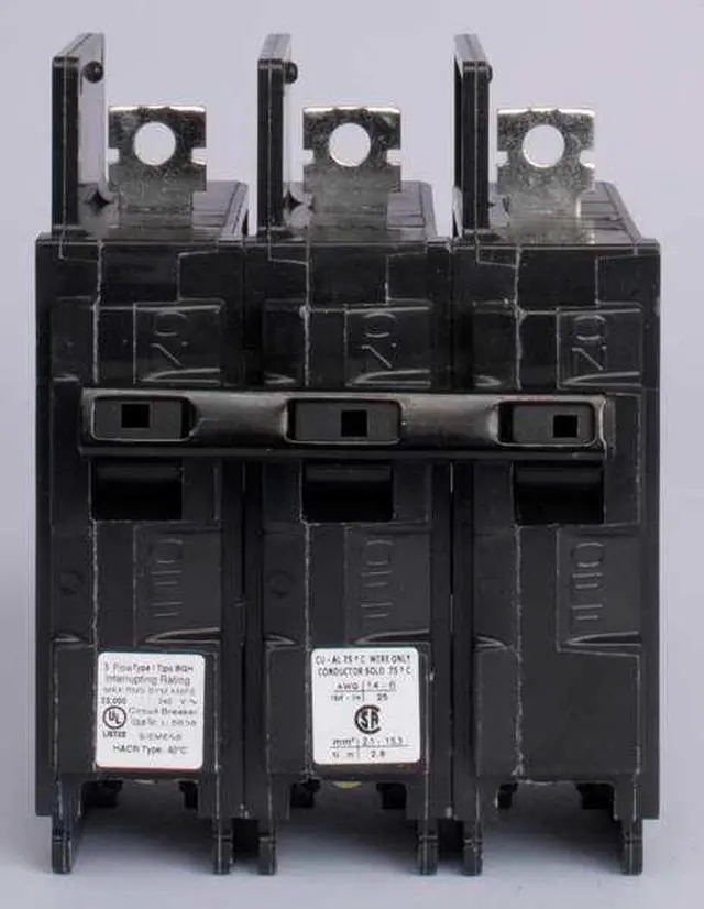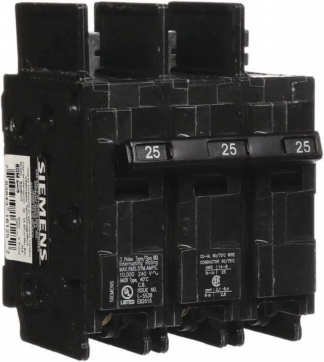 Miniature Circuit Breaker, Amps 25 A, AC Voltage Rating 240V AC, Circuit Breaker Type Standard, Number of Poles 3, DC Voltage Rating Not Rated, Circuit Breaker Actuator Toggle, Circuit Breaker Mounting Style Bolt On, Phase Three, Series BQ, Max. AIR Rating 10kA at 240V AC, For Use With Siemens Panelboards, Terminal Connection Lug, Frame Size 125A/BQ, Length 4 in, Width 3 in, Depth 3 in, Max. Operating Temp. 104 Degrees F, Min. Wire Size 12 AWG (Al), 14 AWG (Cu), Max.