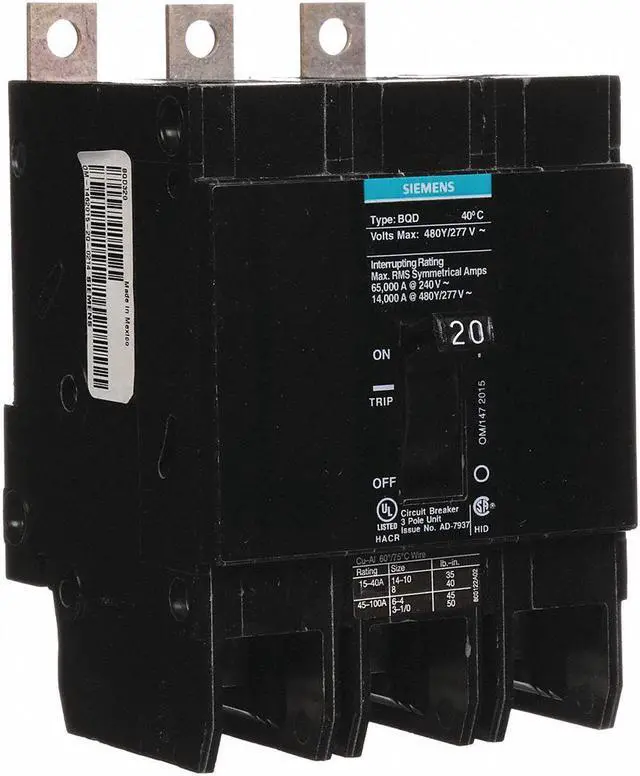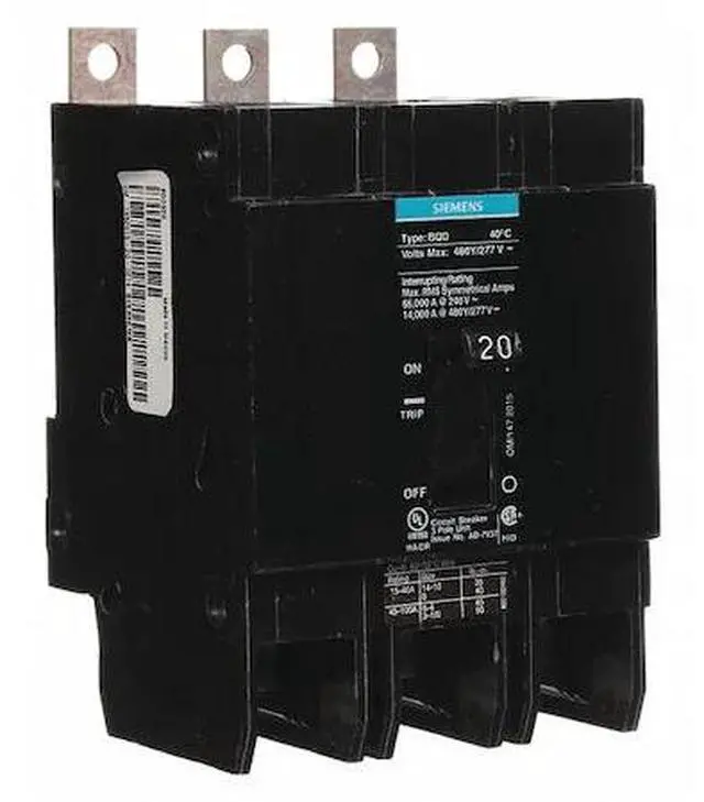 Miniature Circuit Breaker, Amps 20 A, AC Voltage Rating 480V AC, Circuit Breaker Type Standard, Number of Poles 3, DC Voltage Rating Not Rated, Circuit Breaker Actuator Toggle, Circuit Breaker Mounting Style Bolt On, Compatible Panelboard/Load Center Series P1, Phase Three, Series BQD, Max. AIR Rating 14kA at 480V AC, For Use With Siemens P1 Panelboards, Terminal Connection Lug, Frame Size 100A/BQD, Length 4.49 in, Width 3 in, Depth 2.7 in, Max. Operating Temp. 104 Degrees F. This item has been restricted from sale in the following state (s): []