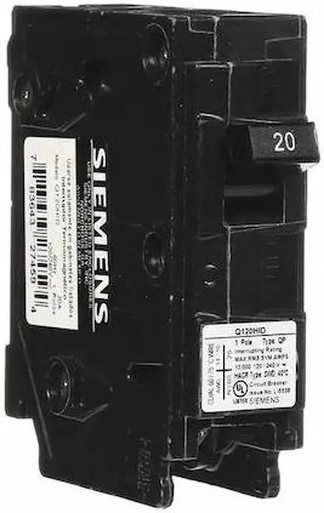 Miniature Circuit Breaker, Amps 20 A, AC Voltage Rating 120V AC, Circuit Breaker Type High Intensity Discharge, Number of Poles 1, DC Voltage Rating Not Rated, Circuit Breaker Actuator Toggle, Circuit Breaker Mounting Style Plug In, Compatible Panelboard/Load Center Series EQ, Phase Single, Series Q, Max. AIR Rating 10kA at 120V AC, For Use With Siemens EQ Load Centers, Terminal Connection Lug, Frame Size 125A/QP, Length 3 in, Width 3 in, Depth 1 in, Min. Wire Size 14 AWG, Max.