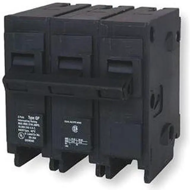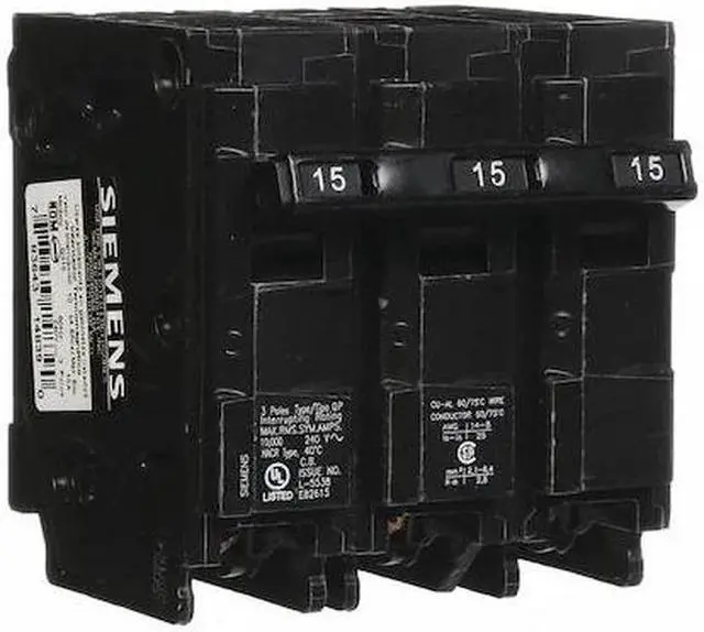 Miniature Circuit Breaker, Amps 15 A, AC Voltage Rating 240V AC, Circuit Breaker Type Standard, Number of Poles 3, DC Voltage Rating Not Rated, Circuit Breaker Actuator Toggle, Circuit Breaker Mounting Style Plug In, Compatible Panelboard/Load Center Series EQ, Phase Three, Series QP, Max. AIR Rating 10kA at 120V AC, For Use With Siemens EQ Load Centers, Terminal Connection Lug, Frame Size 125A/QP, Length 3.4 in, Width 4 in, Depth 12.8 in, Min. Wire Size 14 AWG, Max.