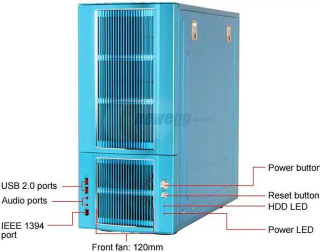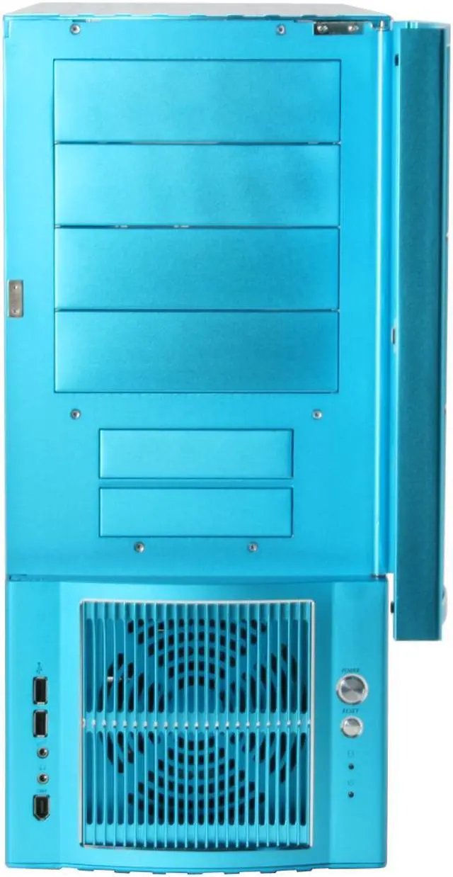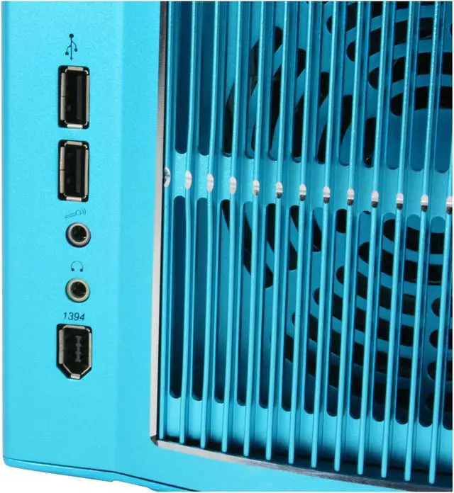Front ports include 2 USB, 2 audio and 1 FireWire. They are placed low on the left side so they are convenient but won't get in the way of the external bays. The power and reset buttons along with the indicator LEDs are on the lower right edge for similar reasons.