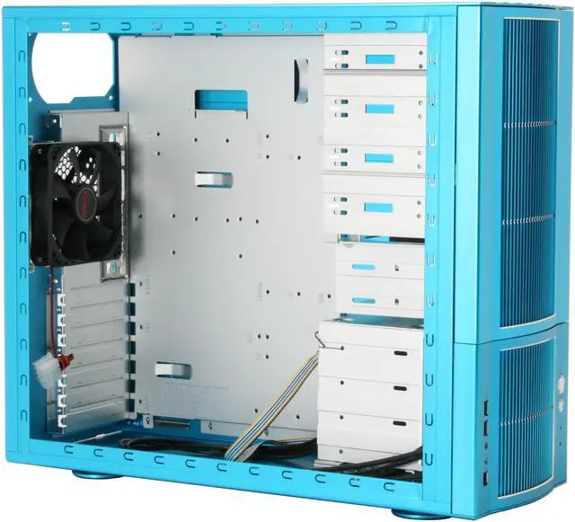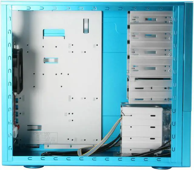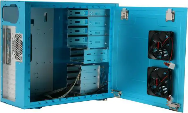 Getting into the case is easy; both side panels have quick release latches eliminating the need to find a screwdriver. Hard drive installation is easy with a four drive cage that rotates so you can slide the drives right in. It also has one of the four 120mm fans in the chassis to keep the drives cool. There are also 6 (2 3.5" and 4 5.25") external bays. All of the drive bays have rubber vibration damping strips to minimize noise. There are 2 120mm fans on the side panel and 1 on the back so your system has maximum airflow to keep it cool.