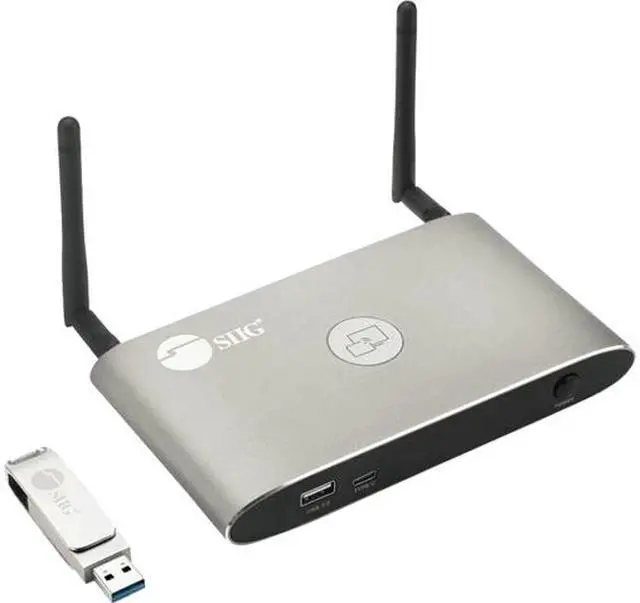 | Specification | HDMI standard: Up to HDMI 2.0 HDCP version: Up to HDCP 2.2 HDMI output: 1x HDMI 19-pin female connector Video resolution (output): 3840x2160@60Hz, 3840x2160@30Hz, 1920x1080@60Hz, 1280x720@60Hz Video playback frame rate: 20-60 FPS Video capacity: 1080P @ <60Hz Airplay for IOS devices / app; 1080P @ <60Hz "WirelessMedia" app; 1080P @ <30Hz for all show-me button Audio input: Airplay, DLNA, Windows/MAC, WMH Analog audio output: 1 x 3.5mm PC audio female connectors Control connectors: 3.5mm Phoenix terminal/ RS232 interface USB interface: USB 3.0 x1, USB 2.0 x1, Type-C x1 Number of window simultaneously on screen (max): 2 + 14 (2 main windows + 14 thumbnail windows) Latency: <100ms, Min 20ms Network connectivity: Wireless data rate: Up to 1200Mbps Wireless transmission protocol: WIFI IEEE 802.11 a/g/n/ac Frequency band: 2.4 GHz & 5 GHz WIFI Antenna: MIMO 2x2 LAN Ethernet port 1: 100Mbps LAN Ethernet port 2: 1Gbps, with POE POE standard: IEEE 802.3af Housing material: Metal USB A/C Dongle: Dimensions: 2.76" (W) x 0.39" (H) x 0.67" (D) Weight: 0.18 lb. Color: Golden Housing material: Metal Connector: 1 x USB 3.0 Type-A, Female 1 x USB 3.0 Type-C, Female |