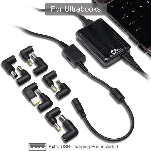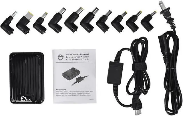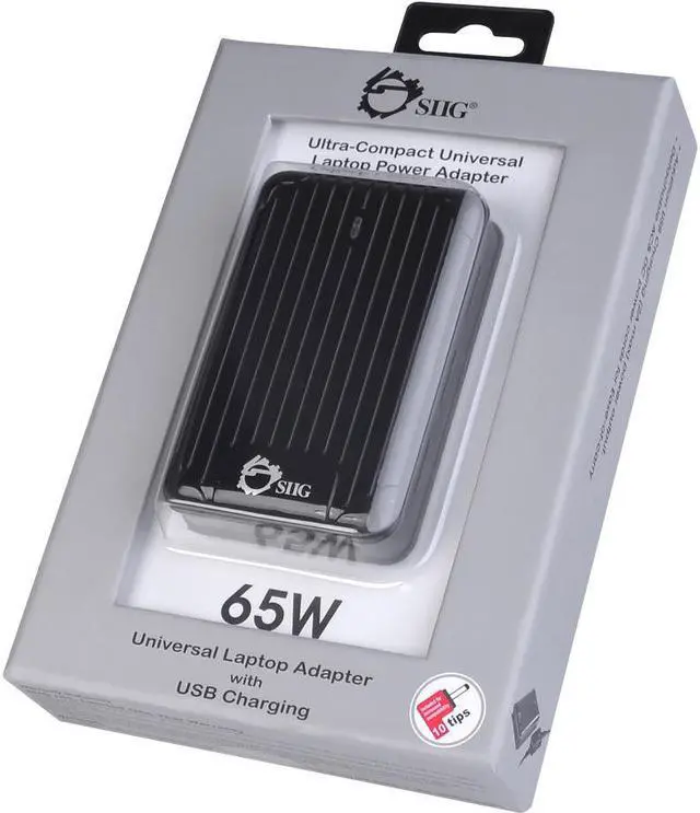 SIIG's Ultra-Compact Universal Laptop Power Adapter - 65W is a high efficiency universal laptop power adapter/charger designed to power your laptop and charge its internal battery at the same time. It includes 10 self-regulating adapter tips to auto-adjust output voltage, safely supporting many compatible popular brands of laptop or Ultrabook computers including ASUS, Acer, Sony, Dell, HP, Lenovo, Fujitsu, Toshiba and more. Built-in protections are provided to protect your device and the charger itself against sudden power surge. And a convenient USB charging port (5V/2A) is also integrated to allow fast charging any USB powered device simultaneously.