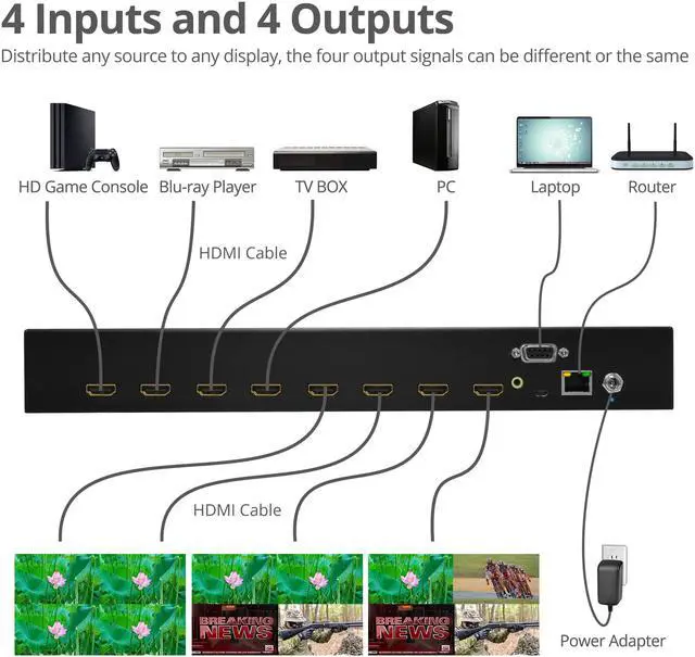 Contents: 4x4 HDMI 2.0 4K HDR Matrix Switch with Cloud Control Power Adapter IR Receiver IR Remote Control Rack-Mount Ear Kit (2+6) Software CD User's