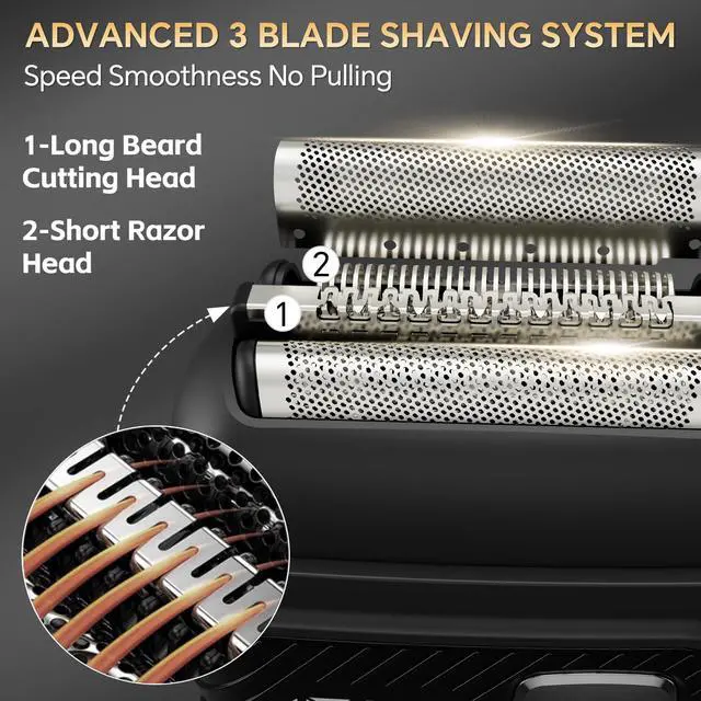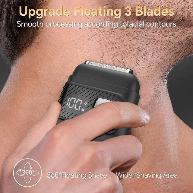 3 Floating Blades: This men's electric razor for features a 3-blade floating blade design, allowing the portable foil shaver to perfectly contour to the face. The men's electric shaver is equipped with built-in smart sensing technology and uses sharp, durable blades to ensure a precise shave. Whether trimming short stubble or long beards, it handles with ease, delivering a smooth, irritation-free shaving experience.