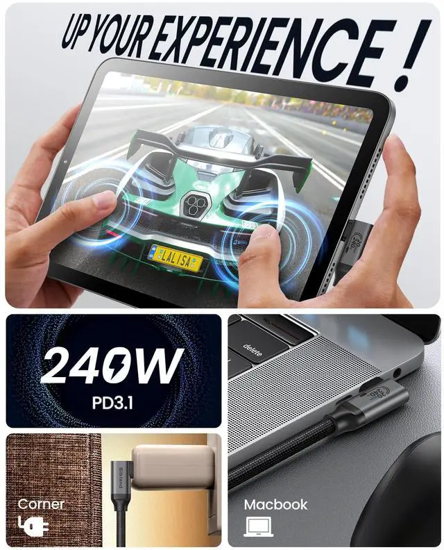 - [240W Ultra Charging Speed] Our usb c to usb c cable elbow supports 240W 48V/5A fast charging. Suitable for 140W/100W/65W/30W USB C port charger. Quickly charge iPhone 15 to 90% and macbook pro to 88% in 35 minutes. Also compatible for MacBook series, iPad series, iPhone 16/15 Plus/Pro/Pro Max, Google Pixel XL/2/2XL/3/3XL/3a/3a XL, Samsung Galaxy S21/ S21+/ S21 Ultra/ Note 10/ Note 10 Plus/ A80 , Dell XPS 17, Huawei P60, Pixel 7 Pro, Surface Pro and more.
