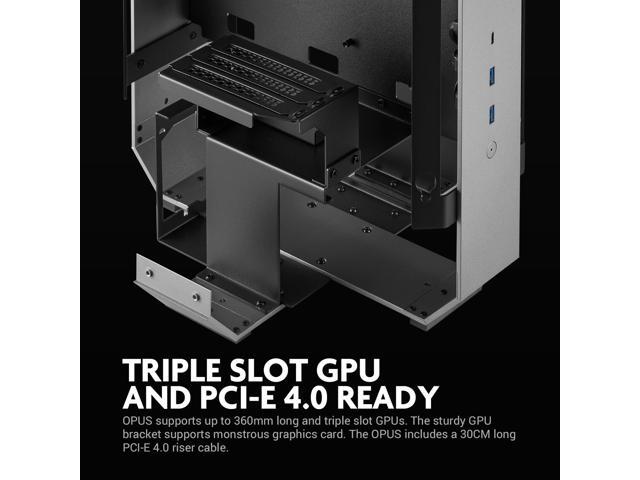 - Supports up to 360mm long and triple slot GPUs. The sturdy GPU bracket supports a large-scale graphics card. The OPUS includes a 30CM long PCI-E 3.0 riser cable.