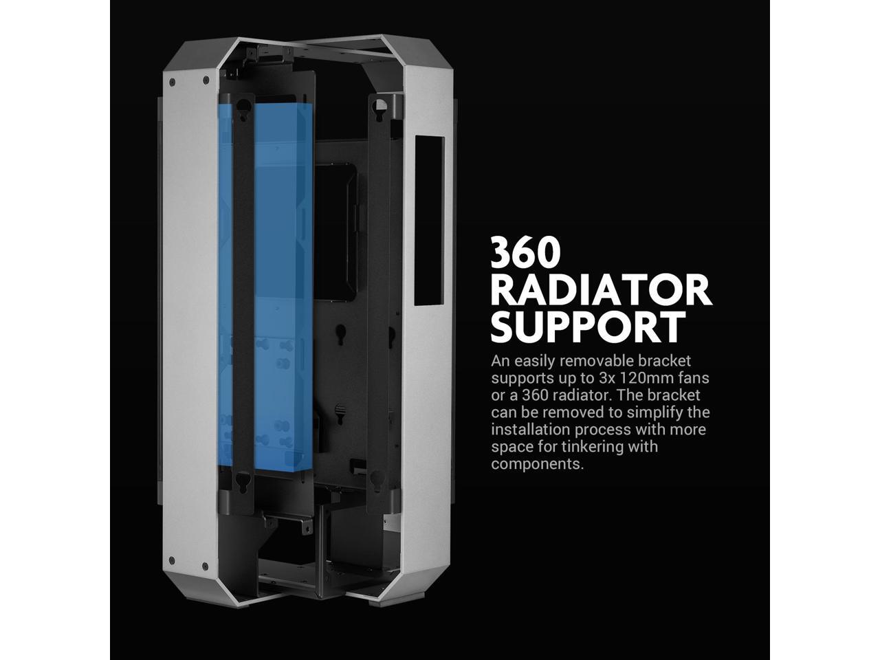 - Easily removable bracket supports up to 3x 120mm fans or a 360 radiator. The bracket can be removed to simplify the installation process with extra space for tinkering with components.