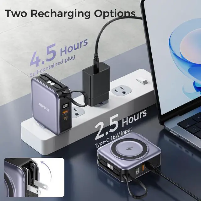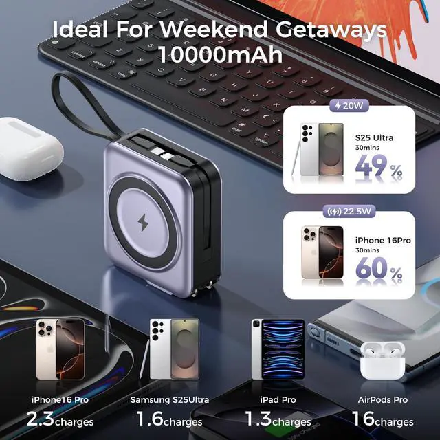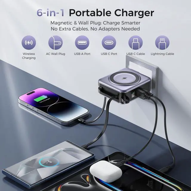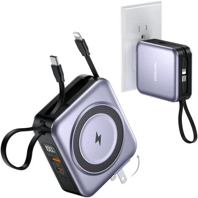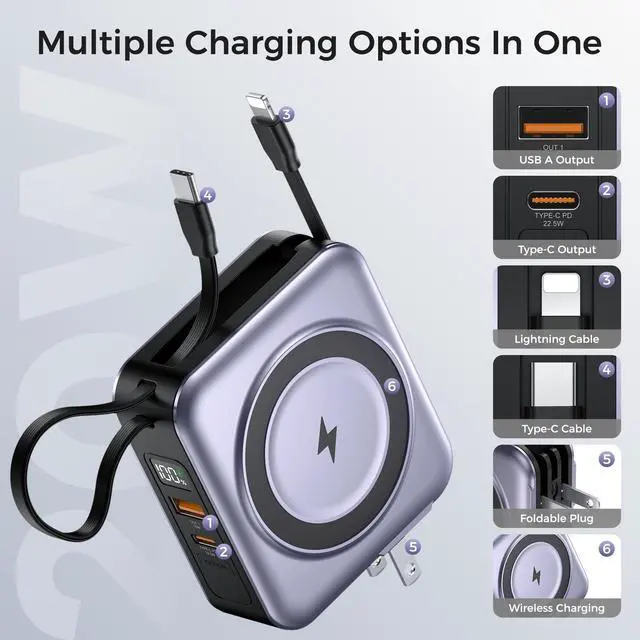 JAYSUING Portable Charger 10000mAh Magnetic with Built-in Cables & Wall Plug, 22.5W PD Fast Charging, LED Display Travel for iPhone 16/15/14/13, Samsung, AirPods, USB-C Devices(Silver Gray)