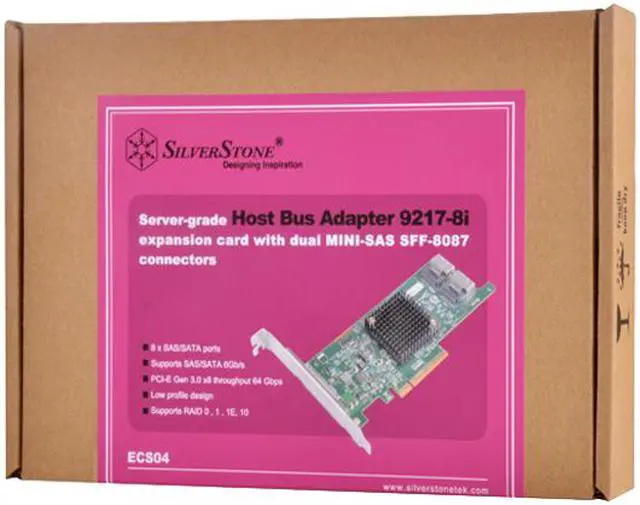 The Silverstone SST-ECS04 add-on card adds RAID capability to your desktop computer to meet the needs for storage expansion and data protection required by high-end and professional users. It has two SFF8087 connectors which supports up to eight SAS/SATA storage drives (single channel), and provides up to 64Gbps bus bandwidth via PCIe 3.0 x8 host interface. With the use of LSISAS2308 RAID controller, this storage expansion card supports RAID 0, 1, 1E, and 10 for redundancy and high availability for your valuable data. Half-height card design allows easy fit into small form factor systems.