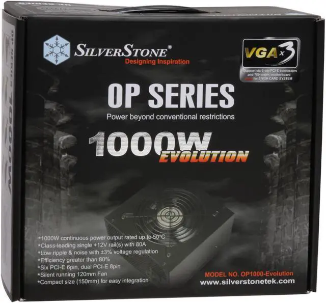 Supports Three VGA Card SystemFeaturing two 8-pin and six 6-pin PCIe connectors, the Silverstone OP1000-E supports up to three high-end graphics cards for extreme gaming systems.
