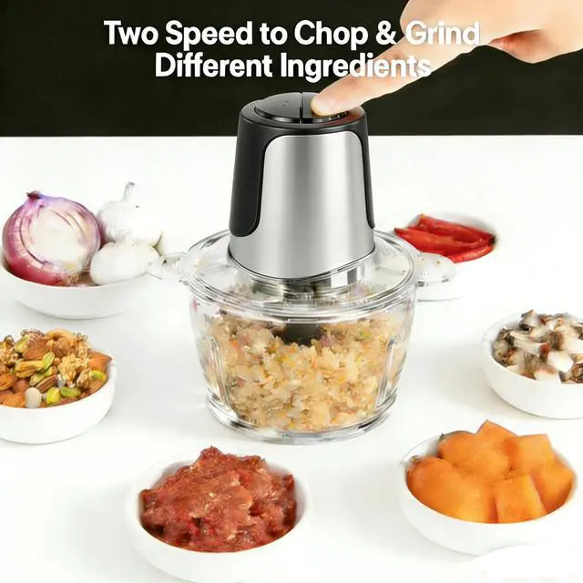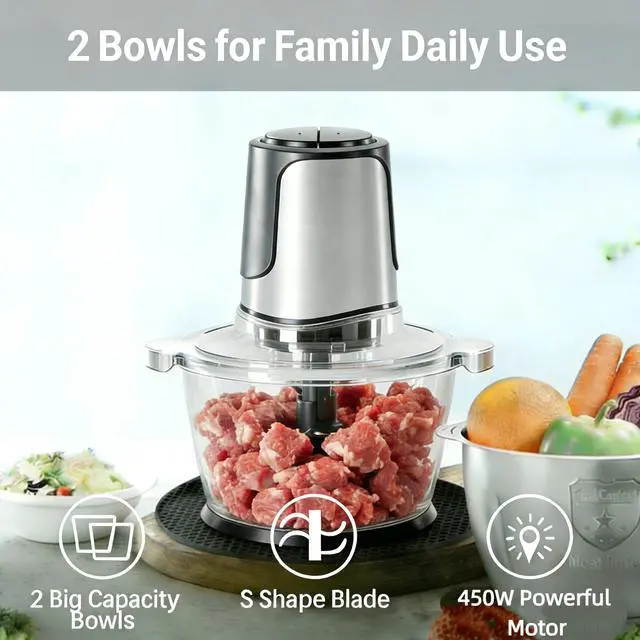 Food Processor & Vegetable Chopper: This 8 Cup small food processor meat grinder is an essential kitchen appliance with a 450W full copper motor for fast chopping, grinding, and blending. Use it as a vegetable chopper for fresh salads or a meat grinder for juicy burgers; 2-speed control handles any ingredient easily