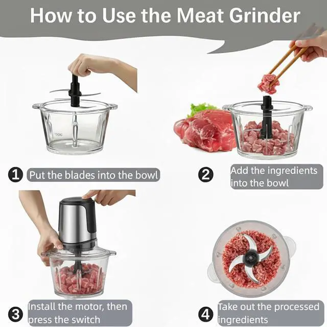 Efficient Motor & Safety Protection: Electric meat grinders for home use is powered by a powerful 450w motor, which can easily and efficiently process all kinds of meat, vegetables and nuts, achieving 60% faster chopping efficiency than lower-power models (6-8 seconds for meats/vegetables). Ergonomic non-slip buttons reduce hand fatigue by 40% during prolonged use, provide good control and stability, which makes food processing easier with a gentle push