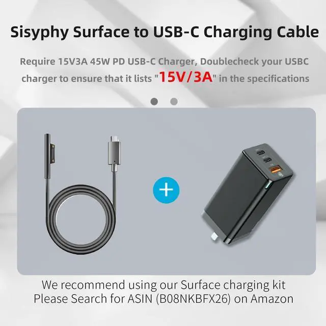 The 15V surface USBC cable allows you charge your Surface via 45W 15V3A USB-C Power Delivery wall charger or power bank. This cable must work with a 15V3A 45W USBC Charger